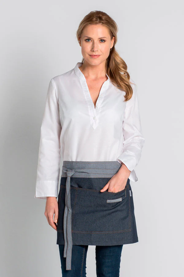 Avental curto confeccionado em tecido ‘texano’. Contraste cinza nas fitas e cós. Dois bolsos. Tamanho único. Comprimento 39 cm x 87 cm de largura. Propostas: restaurantes, esplanadas, cafés, bares, salões, cozinhas, hotéis e restaurantes em geral. Se desejar mais informações, escreva-nos para « Perguntas sobre o produto. ». Composição: 65% Pol., 32% Alg. e intervalo de 3%.