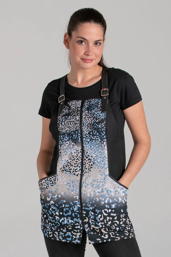 Avental de poliéster preto com animal print em tons de azul e castanho. Alças ajustáveis com fivelas. Dois bolsos inferiores. Aperta com fecho de malha invertida que evita a deterioração por fricção. Comprimento: 75 cm. Dimensionamento: SP-PMG-SG-SSG-XG Propostas: lojas, Cabeleireiros, salões de beleza e dependências em geral. Composição: 100% Poliéster GUIA DE TAMANHOS MULHER Tamanho […]