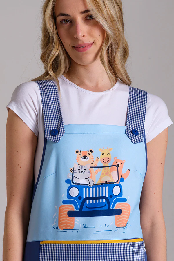 Avental Infantil Azul com Animais de Táxi – Perfeito para Professores, Educadores e Monitores!