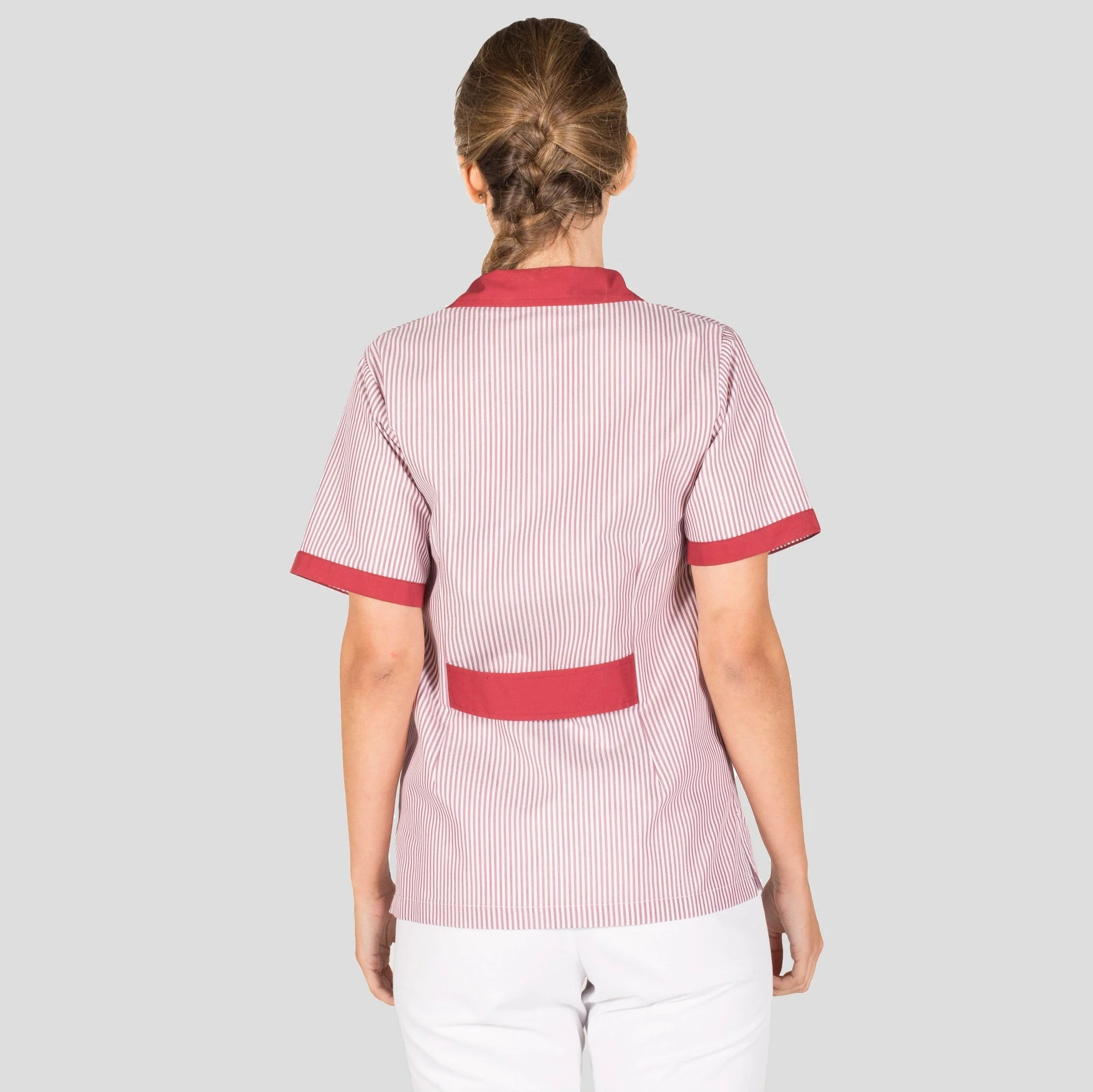 Bata curta feminina, aberto, com botões e mangas curtas. Modelo semi-ajustado, com pinças na frente e nas costas, cinto nas costas e gola de lapela. Possui um bolso no lado esquerdo do peito e dois bolsos laterais. Confecionada em riscas, tem uma combinação no bolso, manga e punhos da gola numa cor sólida. Além disso, possui aberturas nas laterais. Peça muito confortável para uniformes de limpeza geral ou trabalho em Lares.