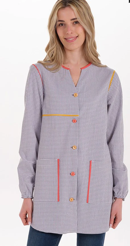 Confeccionada em um tecido cinza aos quadradinhos, macio e confortável, ela oferece um visual moderno e acolhedor. Com decote em V e punhos de elástico garantem praticidade e estilo, enquanto os detalhes em ocre e coral nos bolsos, pescoço e ombros dão um contraste vibrante que chama atenção. Fixada com botões, possui dois grandes bolsos inferiores ideais para levar pequenos objetos com facilidade.