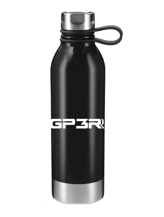 Bouteille d’eau isotherme en acier inoxydable de 25 oz arborant le logo du Grand Prix de Trois-Rivières. Dotée d’un bouchon vissable attaché par une sangle en caoutchouc pour un transport pratique sans risque de perte.