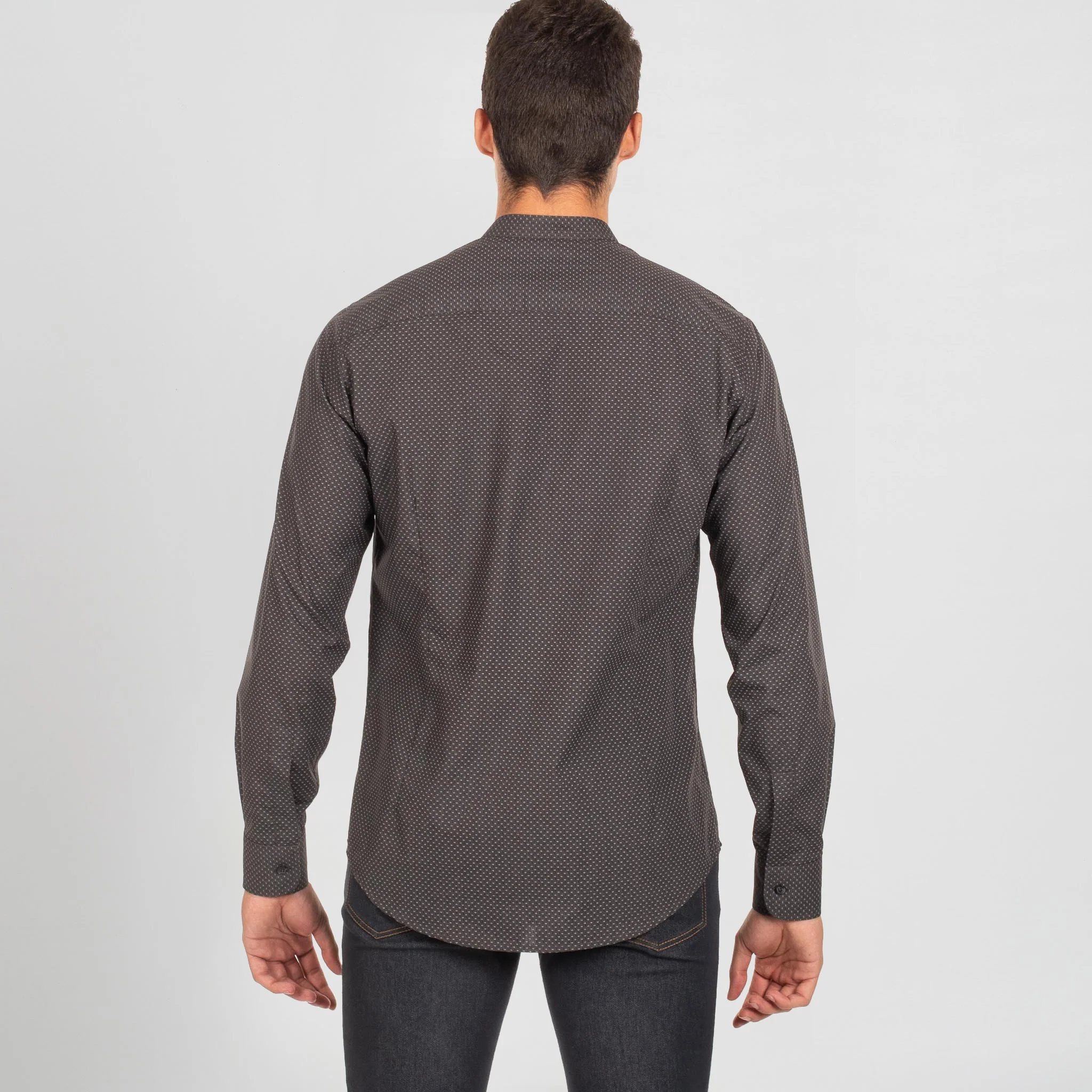 Sofisticação moderna com a camisa Leo Slim Fit para homem, uma escolha excecional para os profissionais que querem destacar-se em qualquer ambiente de trabalho. Esta camisa de manga comprida com gola mao é confeccionada em popeline de camisa com um elegante estampado de amebas sobre um fundo cinzento-carvão, fundindo estilo e originalidade.
