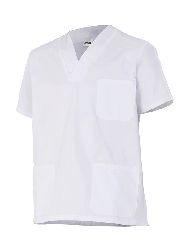 Gola em bico.Aberturas laterais..Três bolsos:.3 bolsos de remendo Sarja. 65% poliéster – 35% algodão Gramagem 190 gr/m2 Dimensão