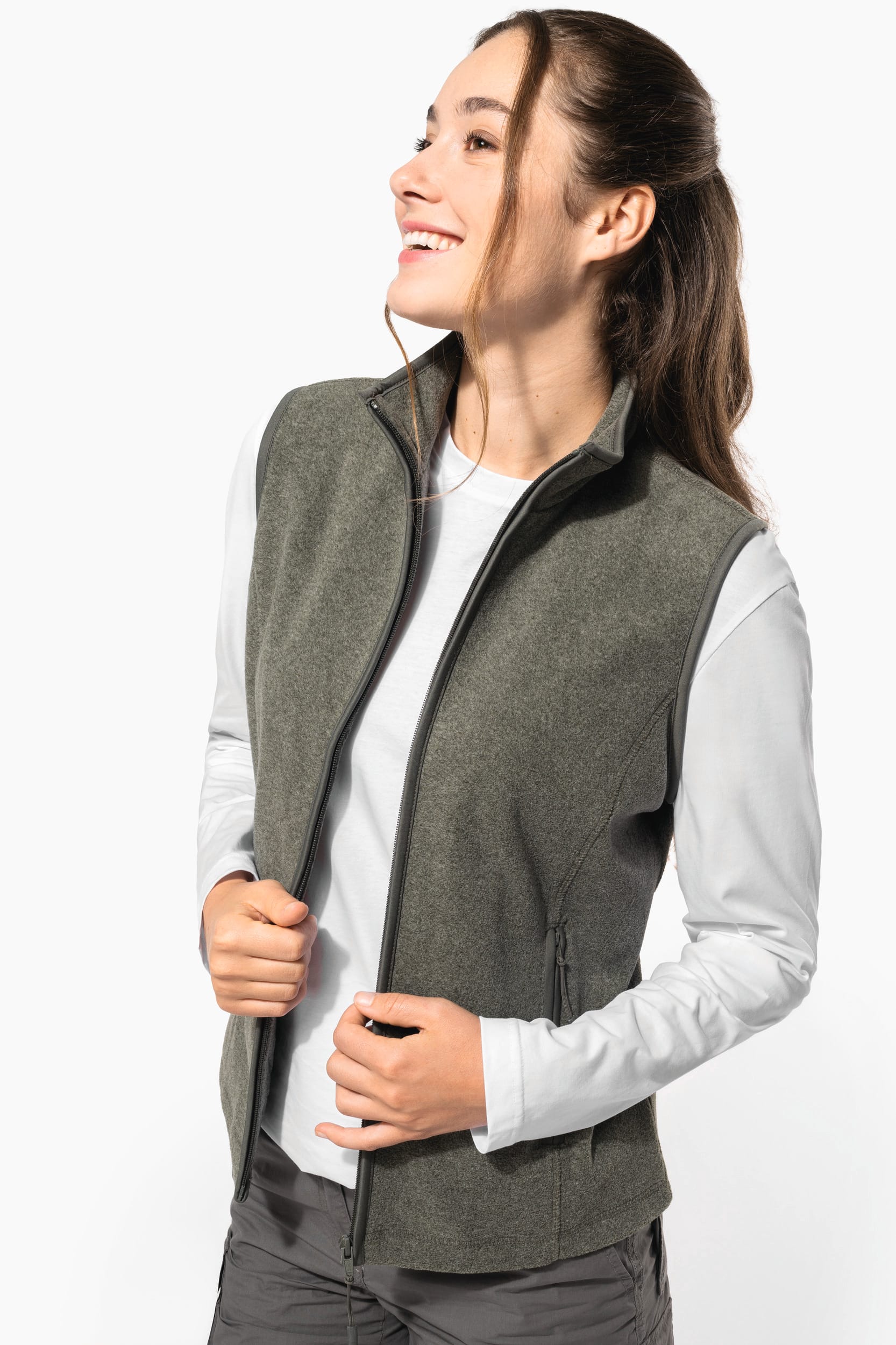 100% poliéster. Corte cintado. Malha micropolar antiborboto. 2 bolsos laterais com fecho. Recobrimento na gola e no fecho.