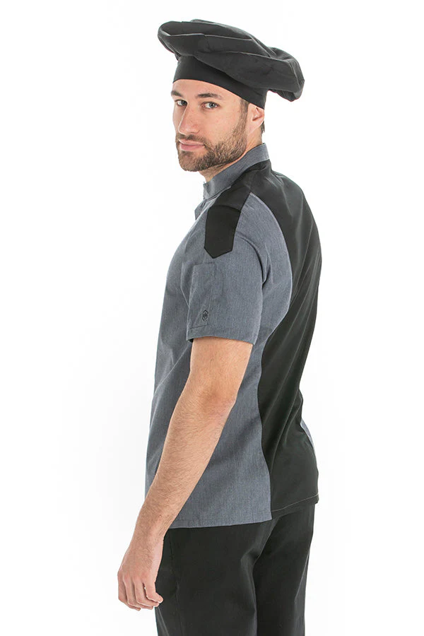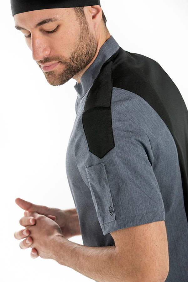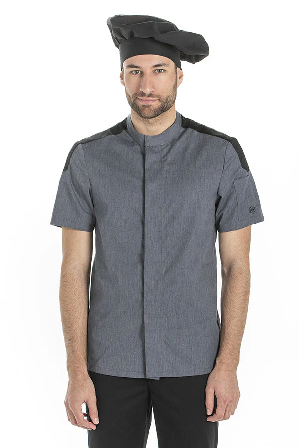 Jaleca cozinha masculina de manga curta. Tecido denim cinza combinado com malha preta respirável nas costas e na linha dos ombros. Gola fechada e fecho com botões de pressão ocultos na carcela. Bolso de aplicação na manga. Peça justa, muito confortável e respirável. Comprimento: 76 cm.
