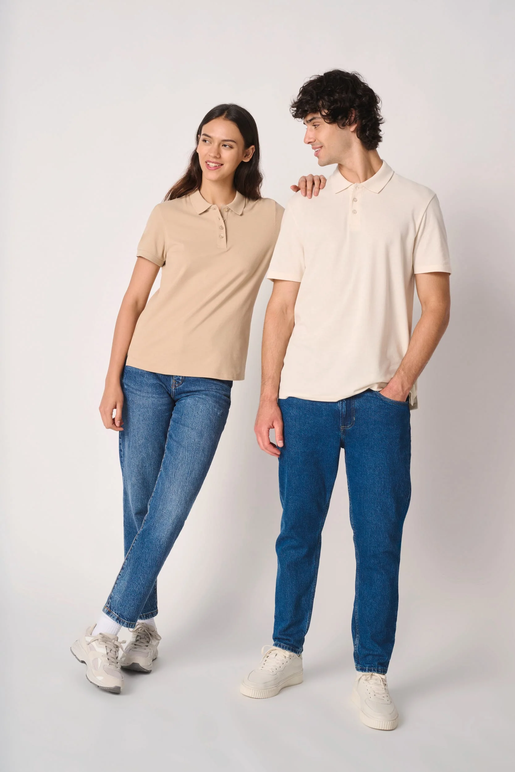 Cores lisas: 100% algodão. Cor Ideal Ash Heather: 99% algodão / 1% viscose. Cor Ideal Oxford Grey: 90% algodão/10% viscose. Malha piqué. Corte direito. Colarinho em malha rib 1×1. Carcela com 3 botões tom sobre tom. Tapa-costuras no interior do colarinho tom sobre tom. Aberturas laterais. Bainha das mangas e do cós com costura dupla. Etiqueta de marca amovível.