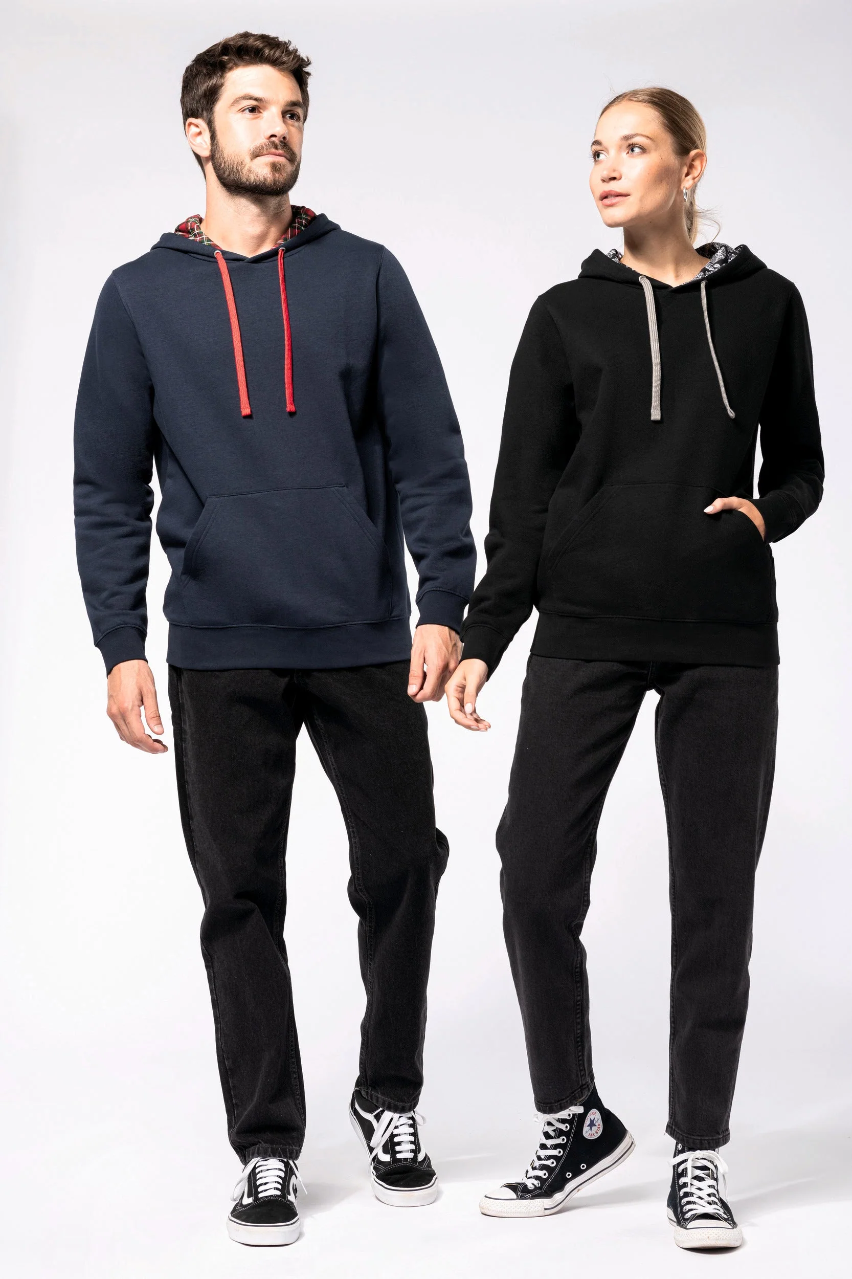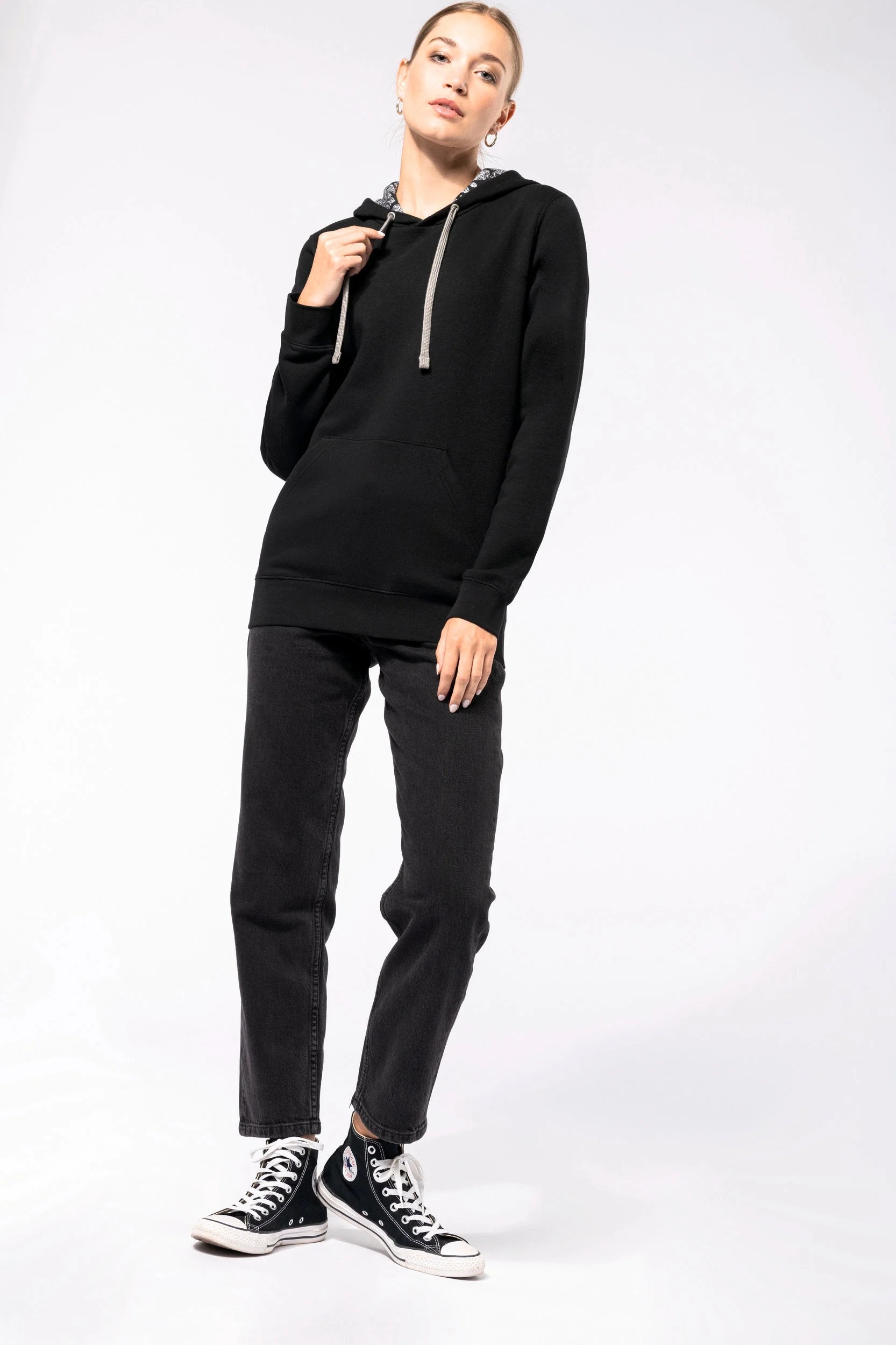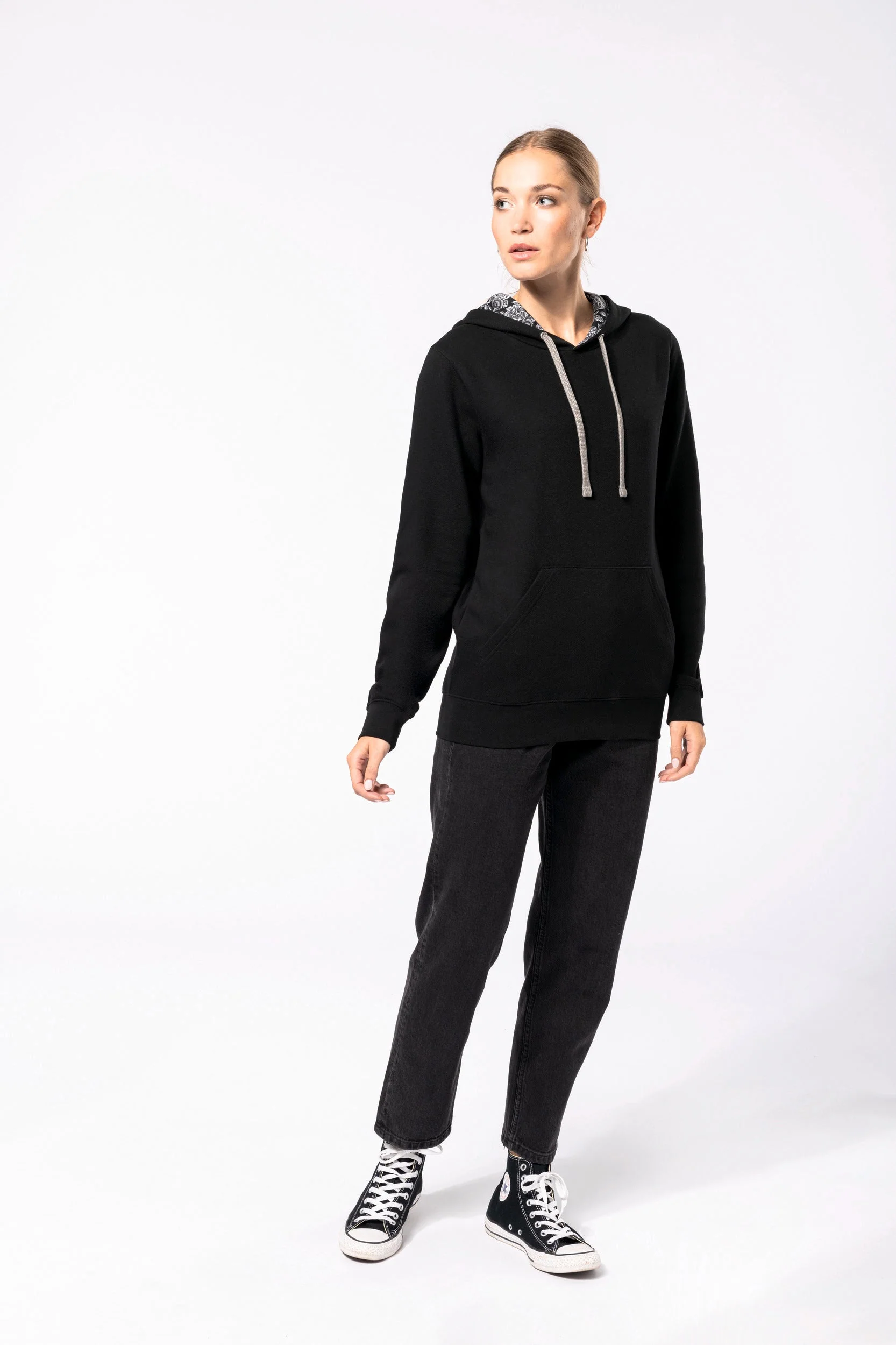 80% algodão penteado/20% poliéster. Cardado 3 fios. Corte justo. Mangas direitas. Bolsos tipo canguru. Acabamento em meia-lua no interior do colarinho para facilitar a personalização. Acabamentos em malha rib 1 x 1 nos punhos e na bainha. Capuz forrado com tecido estampado em algodão jersey impresso e cordão de ajuste em contraste.