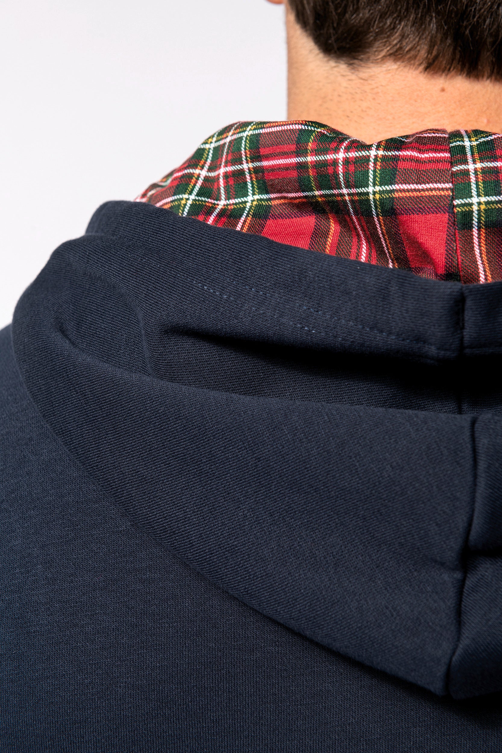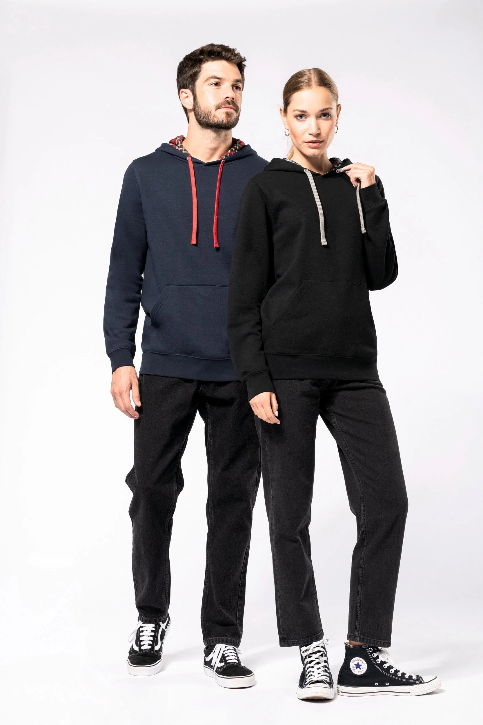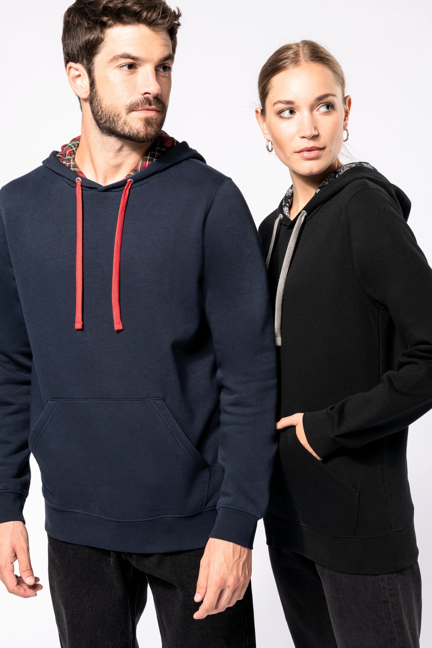 80% algodão penteado/20% poliéster. Cardado 3 fios. Corte justo. Mangas direitas. Bolsos tipo canguru. Acabamento em meia-lua no interior do colarinho para facilitar a personalização. Acabamentos em malha rib 1 x 1 nos punhos e na bainha. Capuz forrado com tecido estampado em algodão jersey impresso e cordão de ajuste em contraste.
