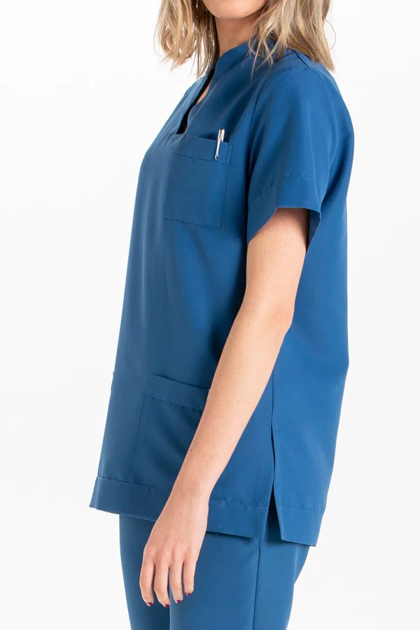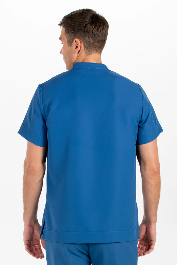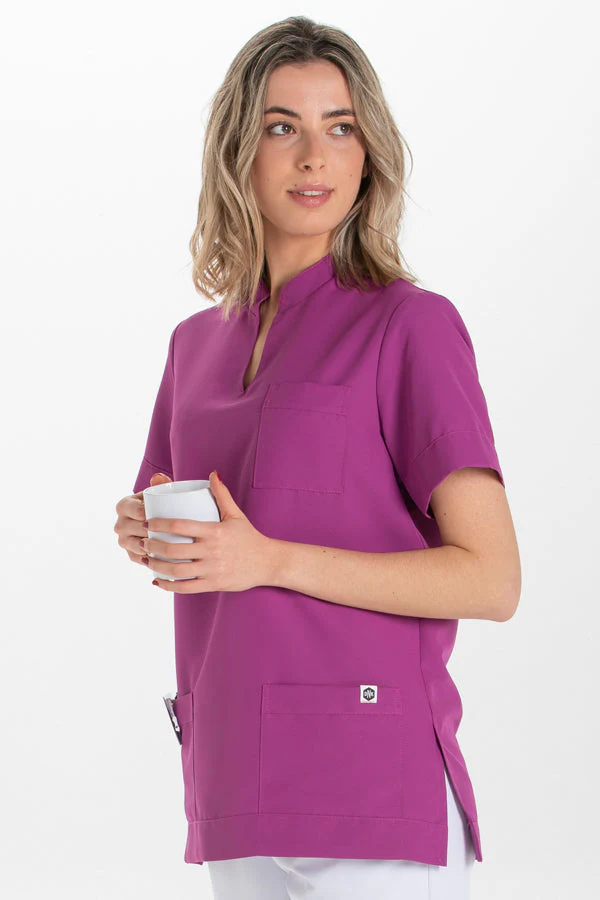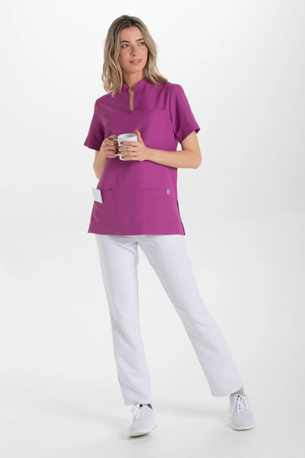 Túnica em microfibra. UNISSEX. Gola mandarim aberta. Mangas curtas com pesponto. Dois bolsos inferiores e um superior. Aberturas laterais inferiores. Comprimento: 75 cm. Tamanho: SP – P- M- G -SG – SSG- XG. Peça macia ao toque, muito leve e fácil de engomar
